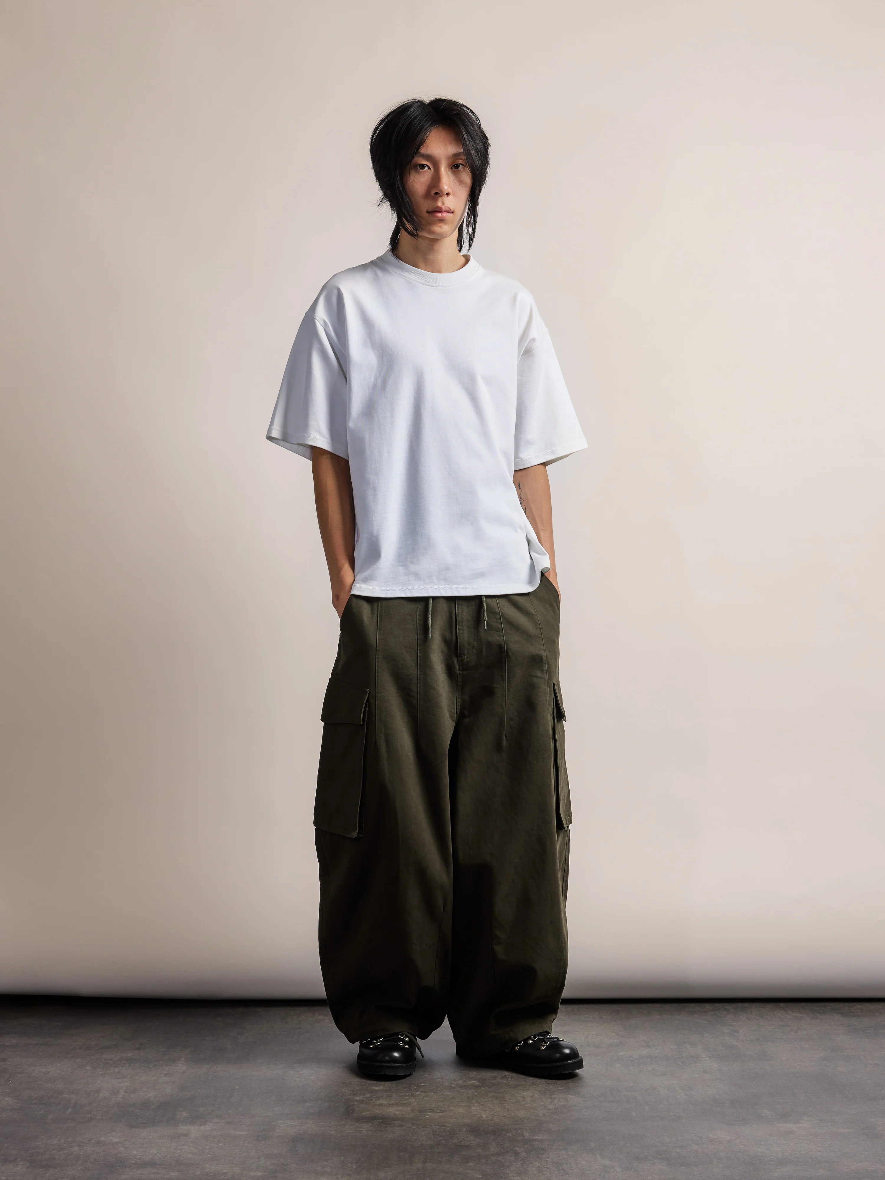 The 1138 BDU Trousers are made from 280GSM cotton micro-twill. They feature 3D cargo pockets with undersized popper closures, a YKK matte metal zip fly, and a custom metal slot button. Adjustable waist and ankle hems allow for a balloon fit. Based on the original military Battle Dress Uniform design, with proportions and detailing informed by science fiction.